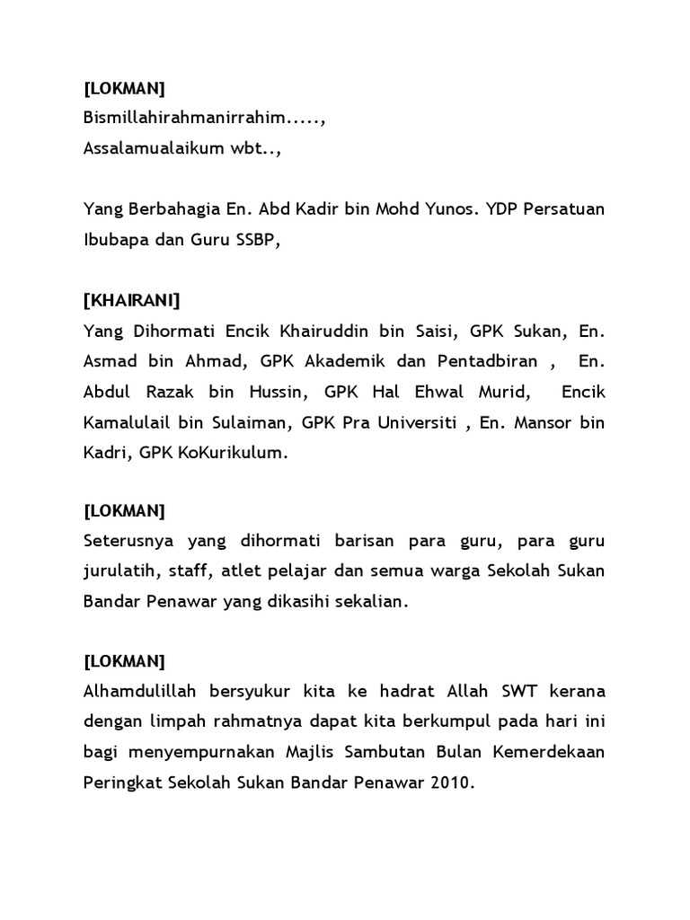 Teks pengacara pelancaran hari kemerdekaan yang ke 57 ulangtahun kemerdekaan malaysia akan tiba beberapa hari je lagi. Teks ucapan pelancaran bulan kemerdekaan peringkat sekolah 2014 1. Lokman alhamdulillah bersyukur kita ke hadrat allah swt kerana dengan limpah rahmatnya dapat kita berkumpul pada hari ini bagi menyempurnakan majlis sambutan bulan kemerdekaan peringkat sekolah sukan bandar penawar 2010. Dan ceria ini kita dapat bersama sama kita berkumpul bagi memeriahkan program sambutan hari kebangsaan dan juga hari malaysia peringkat sekolah.