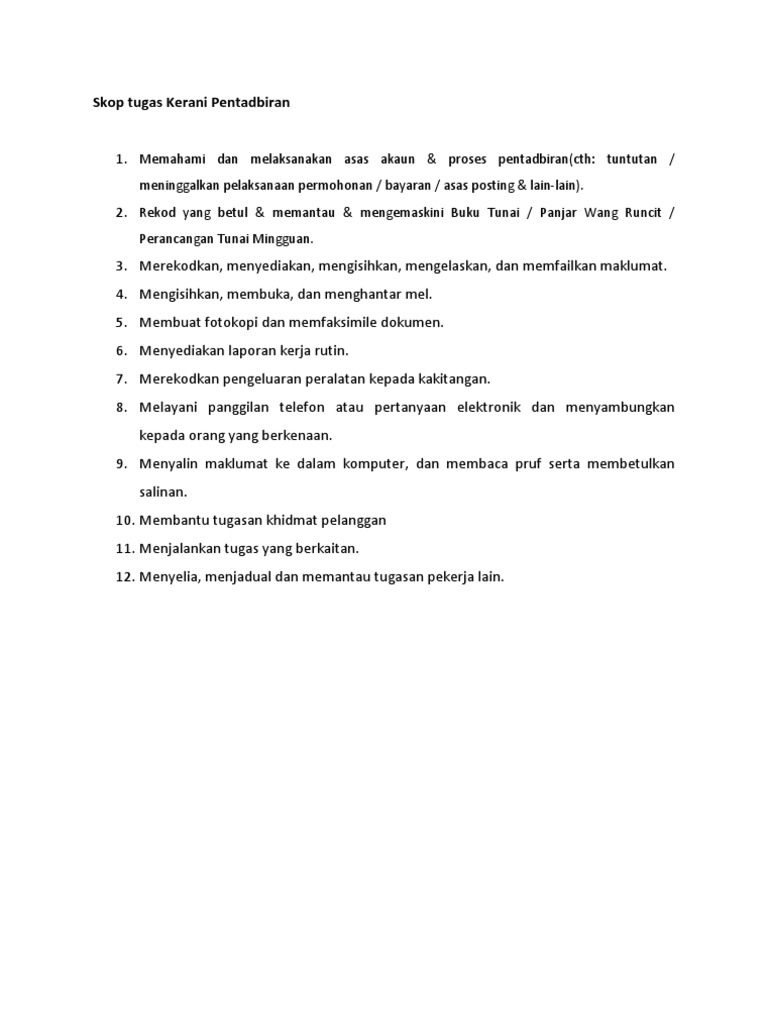 Pergh banyak keyword yang masuk hanya semata mata untuk mencari bidang atau tugas sebenar kerja kerani ini selepas cik tom buat entry. Temuduga dan tugas pembantu tadbir n19. Keterangan tugas kerani akaun mencatatkan memasukkan dalam rekod perakaunan dan simpanan kita membuat pengiraan yang sewajarnya melaksanakan fungsi perakaunan dan simpanan kita yang terhad mengira kos pengeluaran dan pengendalian menyediakan senarai gaji dan rekod yang berkaitan untuk gaji pekerja dan bagi tujuan penyimpanan rekod berkanun. Kerani am pejabat menjalankan pelbagai tugas yang telah dikelaskan dalam mana mana pekerjaan perkeranian pejabat yang khusus dan memerlukan pengetahuan yang terhad dalam sistem dan prosedur pengurusan pejabat.
