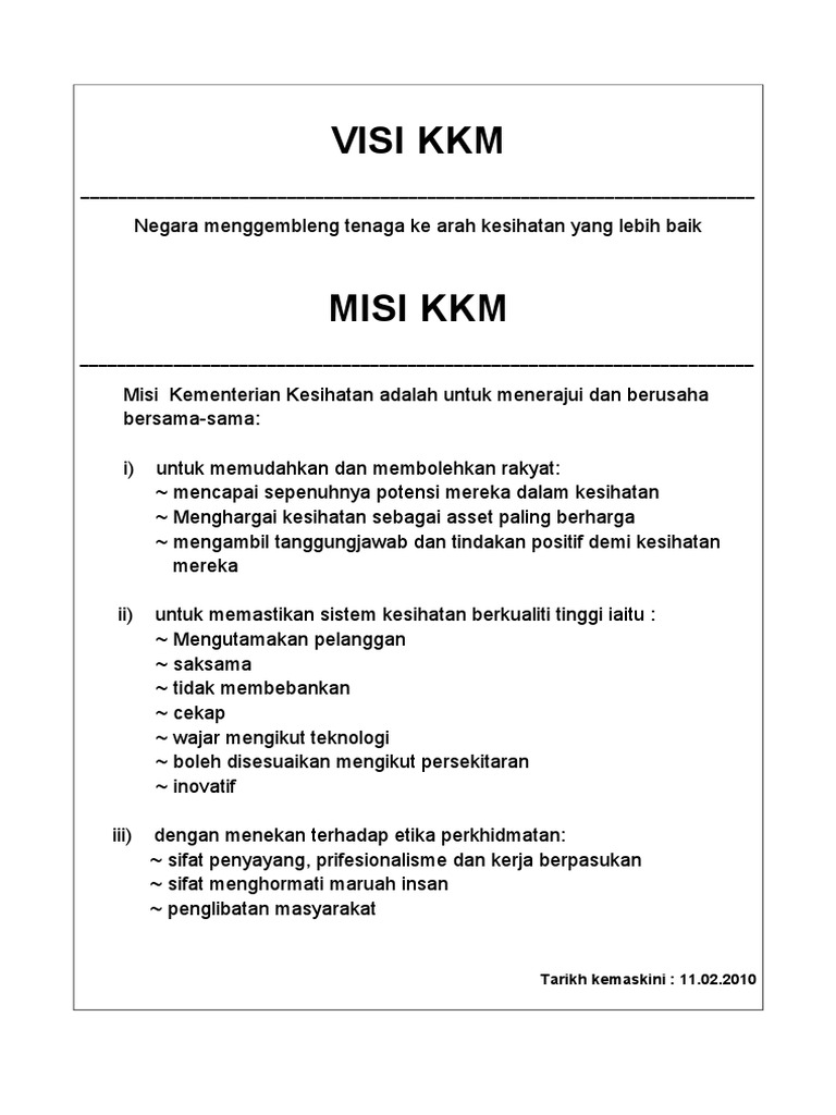 Visi dan misi kkm. Mencapai sepenuhnya potensi mereka dalam kesihatan menghargai kesihatan sebagai aset yang paling berharga mengambil tanggungjawab dan tindakan positif demi kesihatan mereka 2. Untuk memudahkan dan membolehkan rakyat. Memberikan perkhidmatan yang berkualiti kepada. Menghargai kesihatan sebagai aset paling berharga.